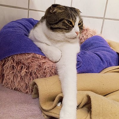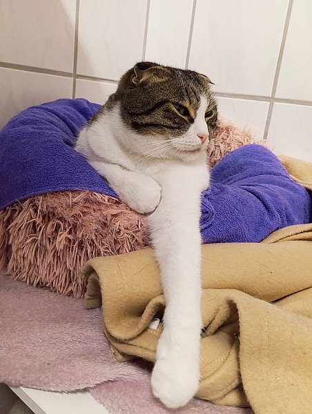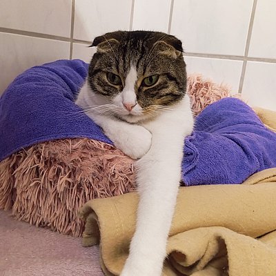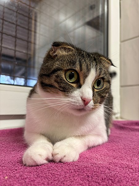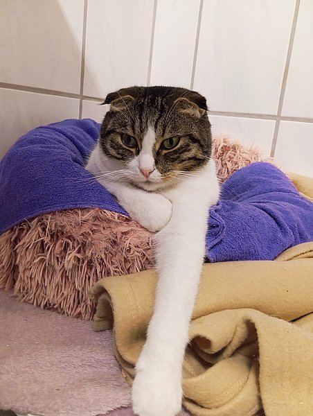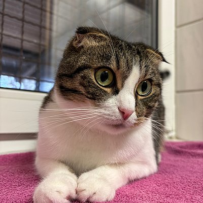 Sie ist eine Scottish Fold und damit gehört sie zu einer sogenannten Qualzucht. Das ist wichtig, offen und ehrlich zu benennen. Bei Qualzuchten werden äußere Merkmale gezielt gezüchtet, obwohl sie nachweislich gesundheitliche Schäden verursachen. Bei der Scottish Fold sind die gefalteten Ohren kein süßes Extra, sondern Ausdruck eines Gendefekts, der den gesamten Knorpel- und Knochenapparat betrifft. Die möglichen Folgen sind Schmerzen, Gelenkveränderungen, Bewegungseinschränkungen. Ein Leben lang.